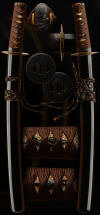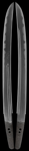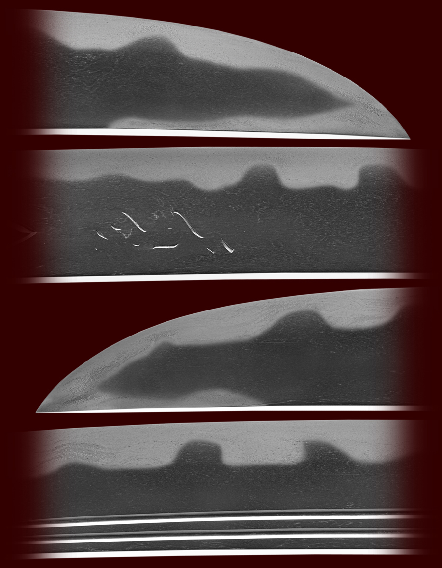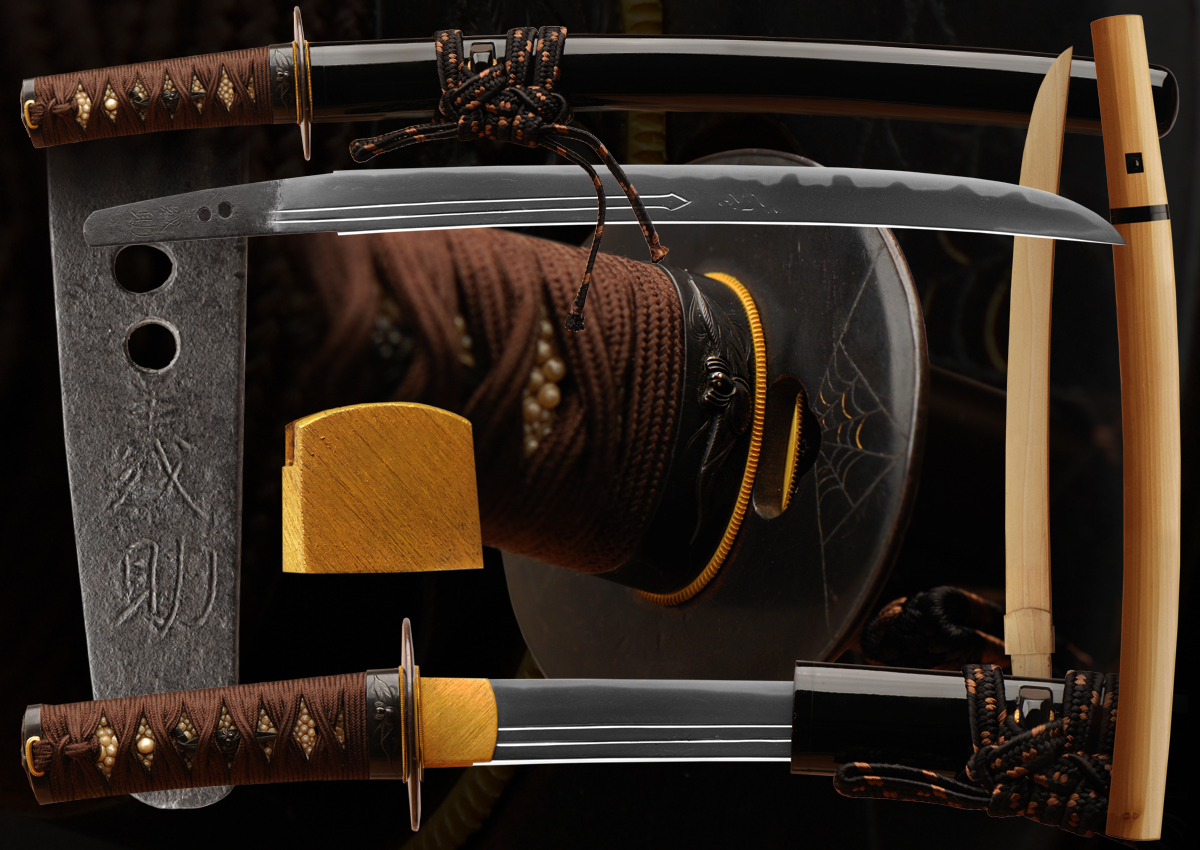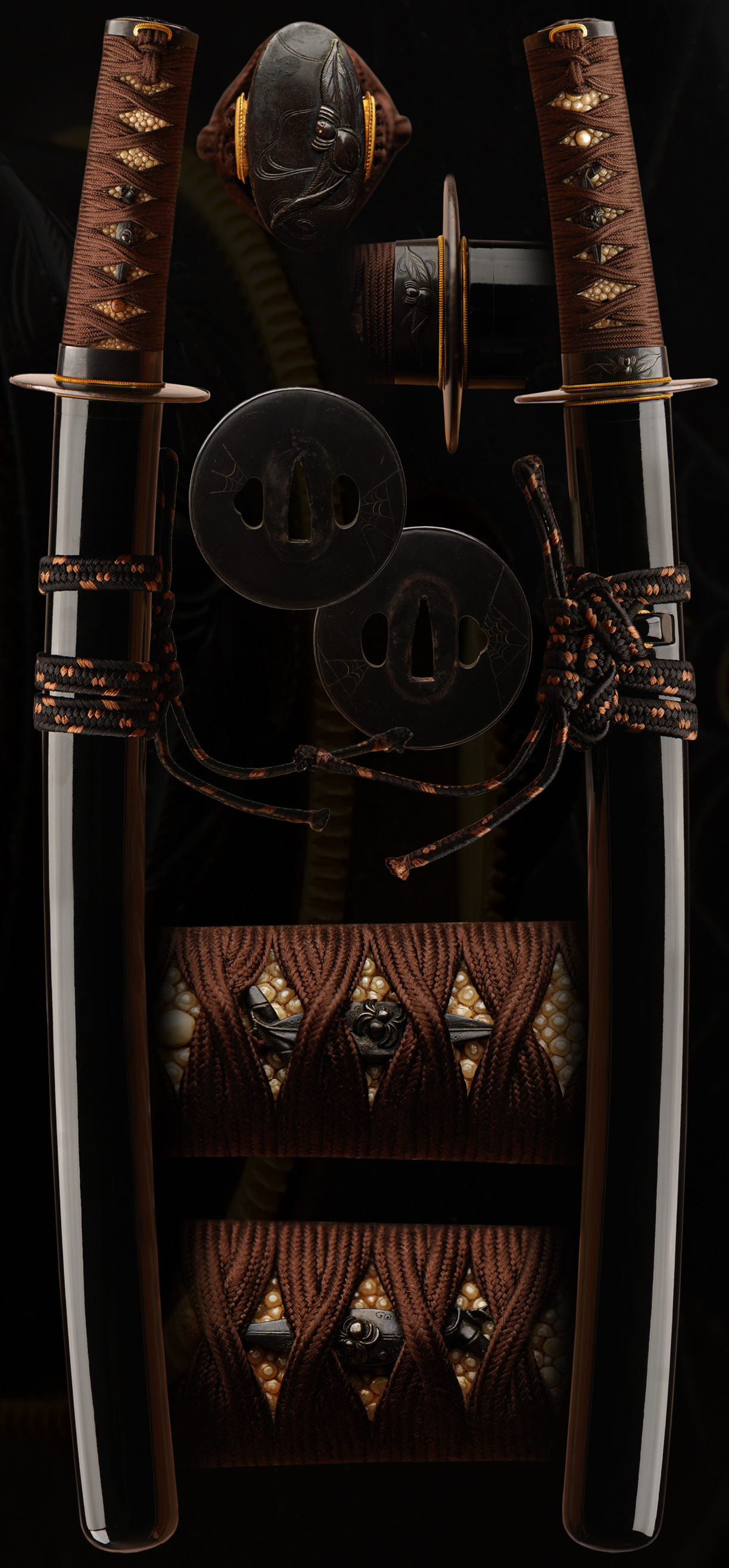 This is a very good quality koto tanto with original horimono/carvings. The blade is rather wide and healthy. The hamon is active with many fine hataraki/activity. The hada is well forged and is O-itame with a silky appearance to it. The carving is in good shape as is the hada for such an old sword. This blade is in a shirasaya with a great quality horn inlay. The sword comes with mounts that are in matching spider motif. Matching fitting like this are not found easily and this should be noted as they are very nice. The overall feel and look of this rather long tanto is that of quality and beauty. This blade also comes with papers attesting to the signature and quality.