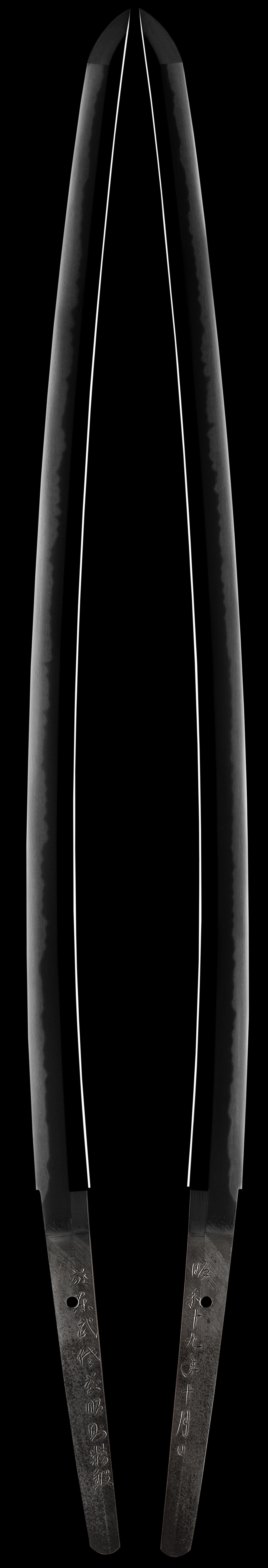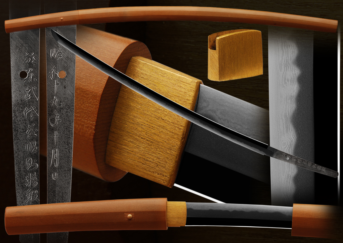 Akinori was a student of Akihide. He died young so few swords by him were made. Most of his swords were signed differently. This one was obviously a special order blade and therefore signed this way. He added at the end of his signature Seitan or "well made". This is one of the best quality gendaito that we have offered for sale. The signature is 100% genuine. This sword was polished by Moses Becerra in his preferred sashikomi style polish that is very difficult to do. The beauty an elegance of this sword is clearly visible even for a novice collector. The hamon is balanced very well and has many hataraki/activity from sunagashi, ashi, yo and many more. Please look at the pictures for more details. Actually this sword looks better in hand. The hada is forged in a ko-itame style and is very silky and has a even milky appearance to it. For a collector interested in owning a high quality gendaito, this is a great choice for its beauty, condition and quality.