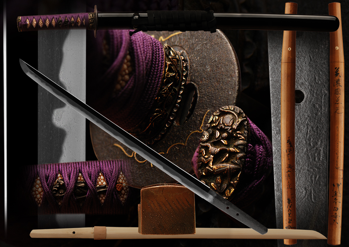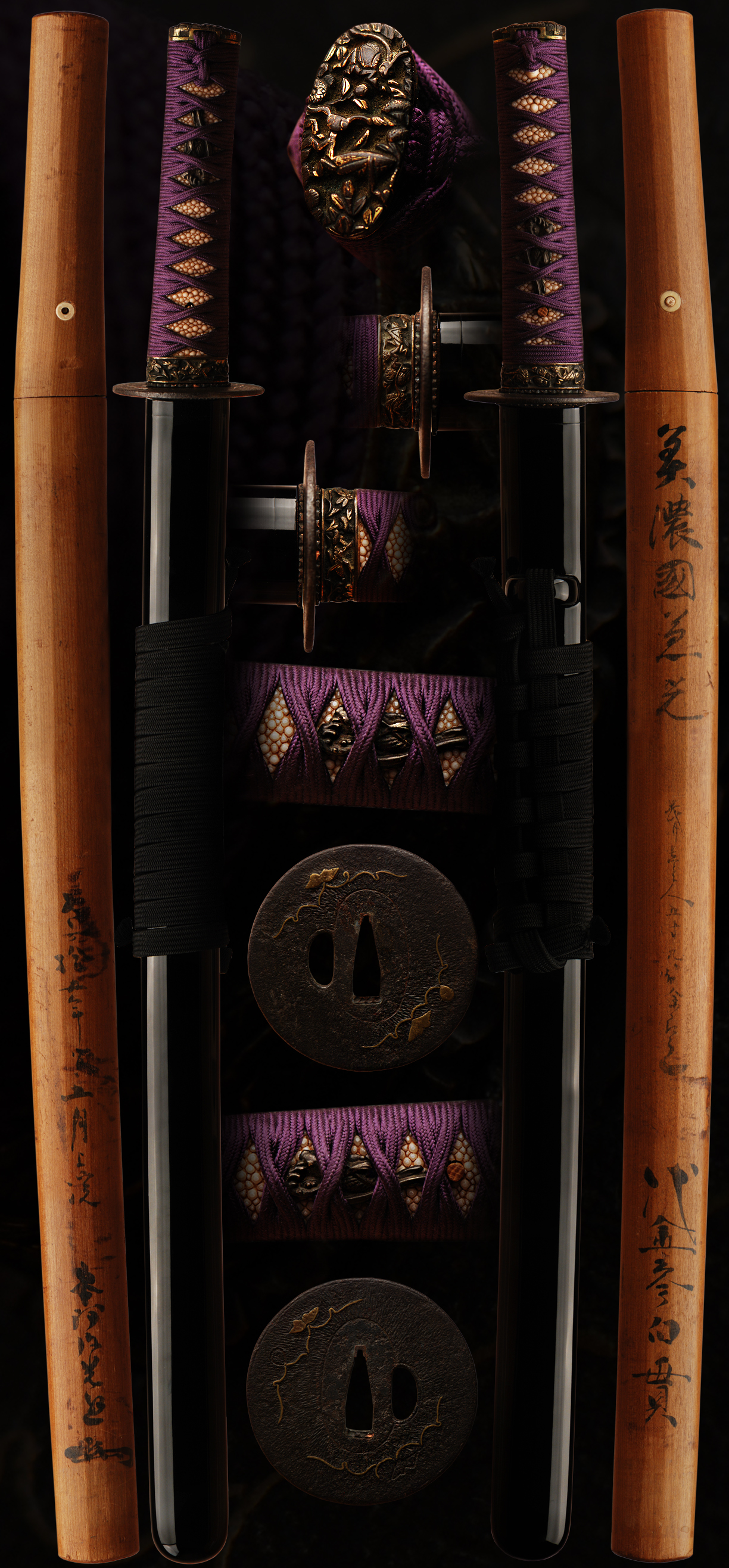 very nice quality from tsuka to saya. The bug theme with floral motif beautifully finish the tsuka with an exceptional deep purple tsukaito wrap. The saya is an exquisite black lacquer . The floral motif was often used as a theme for Asian art. Mythological subjects and auspicious symbols were sometimes used as motifs for Japanese sword furniture. Floral motifs could stand alone as designs unto themselves, particularly if they had seasonal or symbolic associations, but they were also used as decorative patterns surrounding or backing more pictorial motifs such as bugs etc.