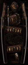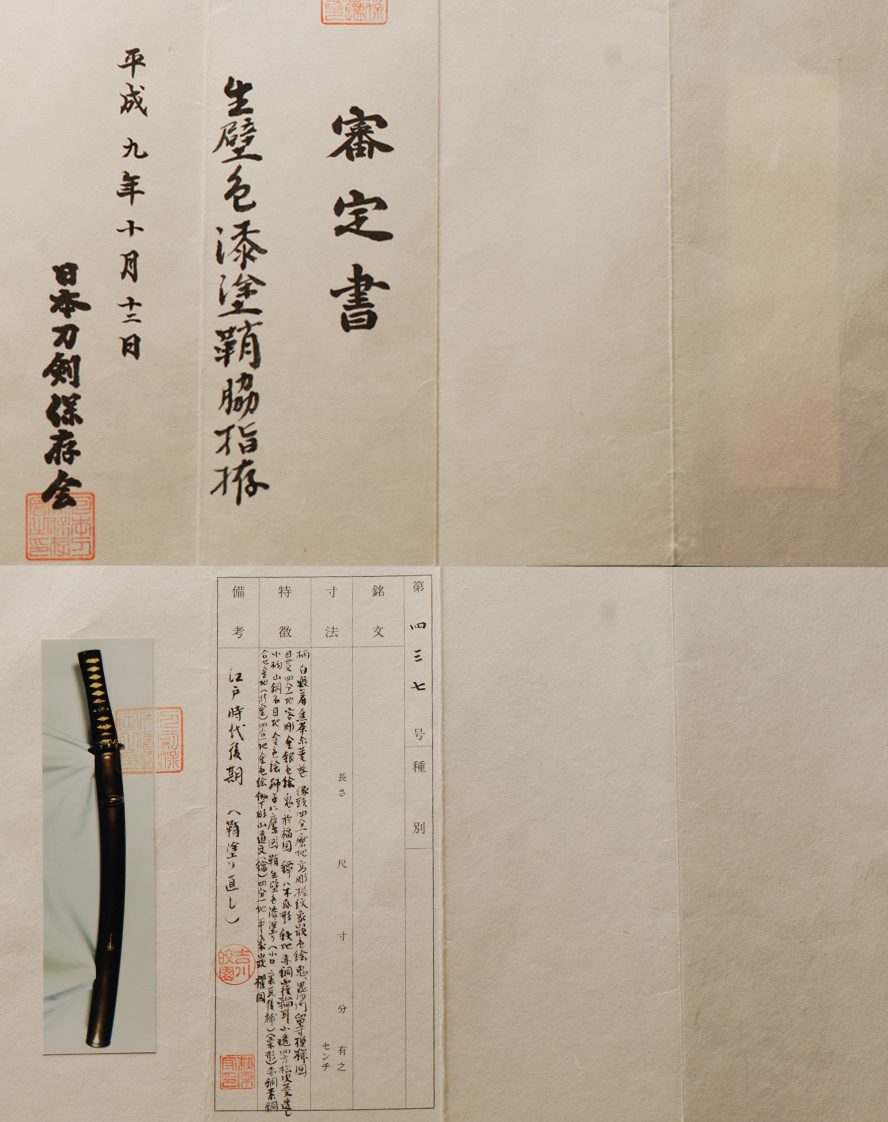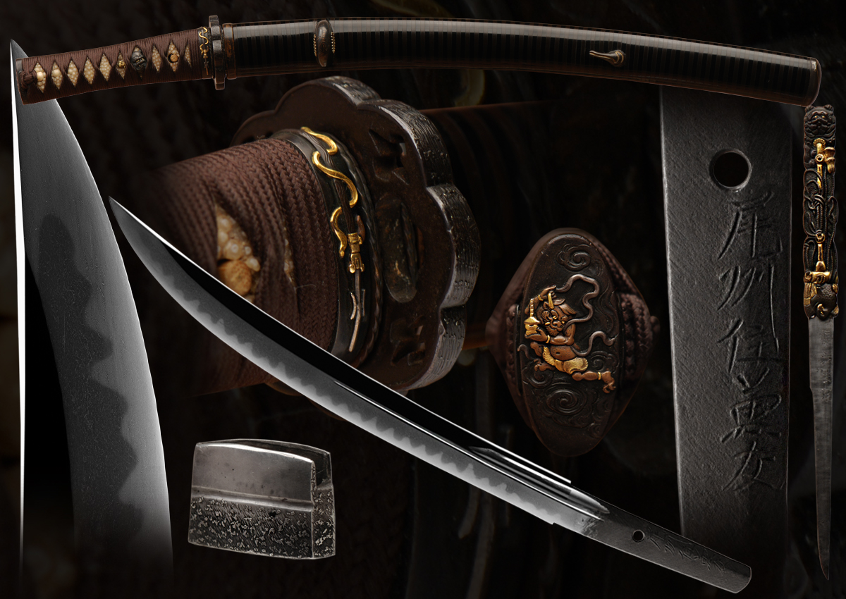 . It reads �Bishu Ju Kanetomo�.The koshirae is of a quality lacquered saya with strirated design. The saya is a mix of a beautiful glossy black and brown striped lacquer and appears to be from the late Edo period. This package is a standout. The tsuka has a brilliant brown ito. The menuki are a fine quality gold with shakudo of ancient noi mask design. The fuchi kashira are a fine quality shakudo with ONI relief on the kashira. There is a fine quality kodzuka of rope and an iron tsuba with beautiful cutout relief work. There is naginata hi on both sides of the blade.