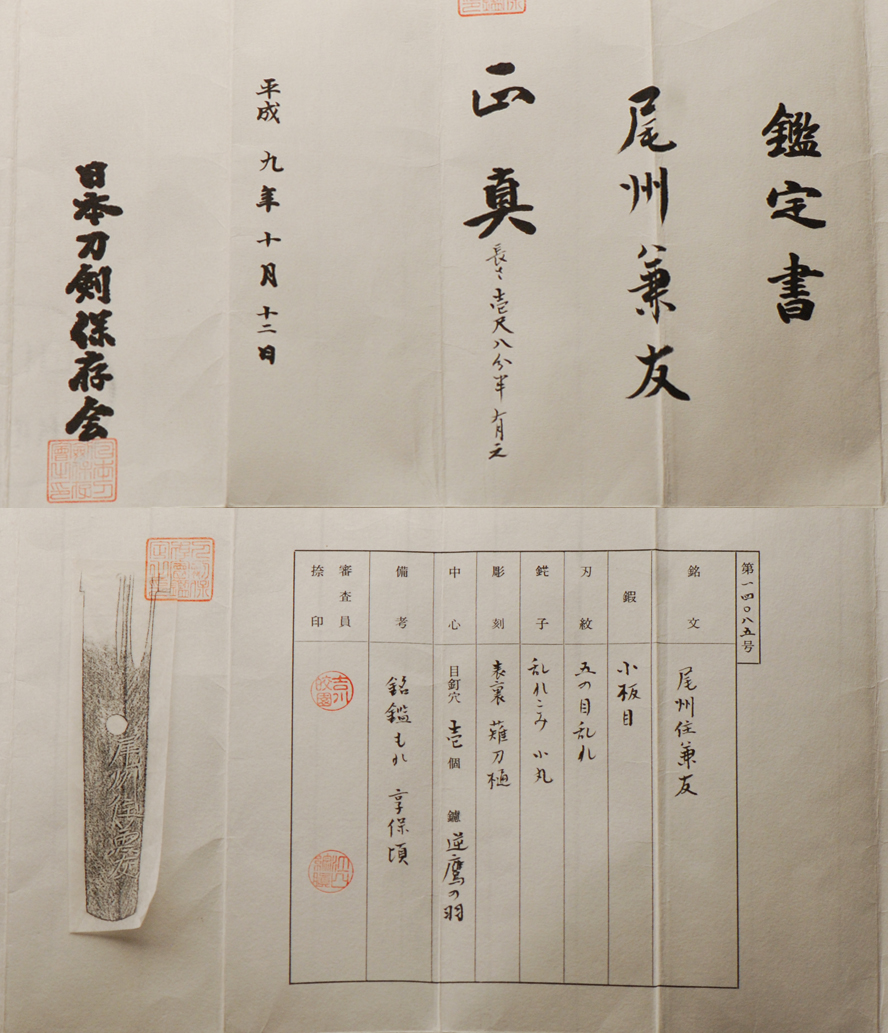 This rarely made Tanto comes in a very nice older polish. The hamon is an erratic blend of gunome-midare with much togare-ba. The blade was made in the owari/bizen style probably from the shinto era prior to the 19th century. The hada is a ko- itame. This Tanto shows off the swords fine uniqueness. The blade is signed and papered as meikan more which means it was not found in the meikan