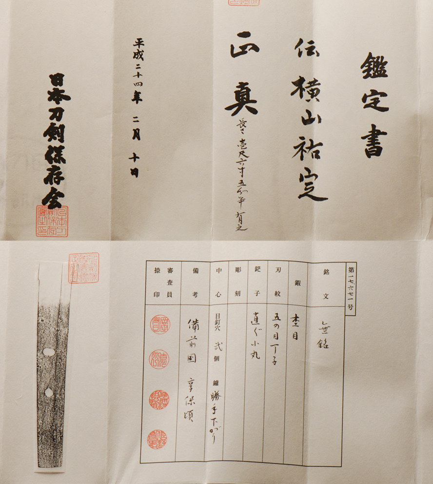 It comes mounted in shirasaya with an antique 2-piece silver habaki. A brilliant example of a Bizen Sukesada sword with an abundance of hataraki. The blade comes with papers attributing it to this school of the Bizen tradition.