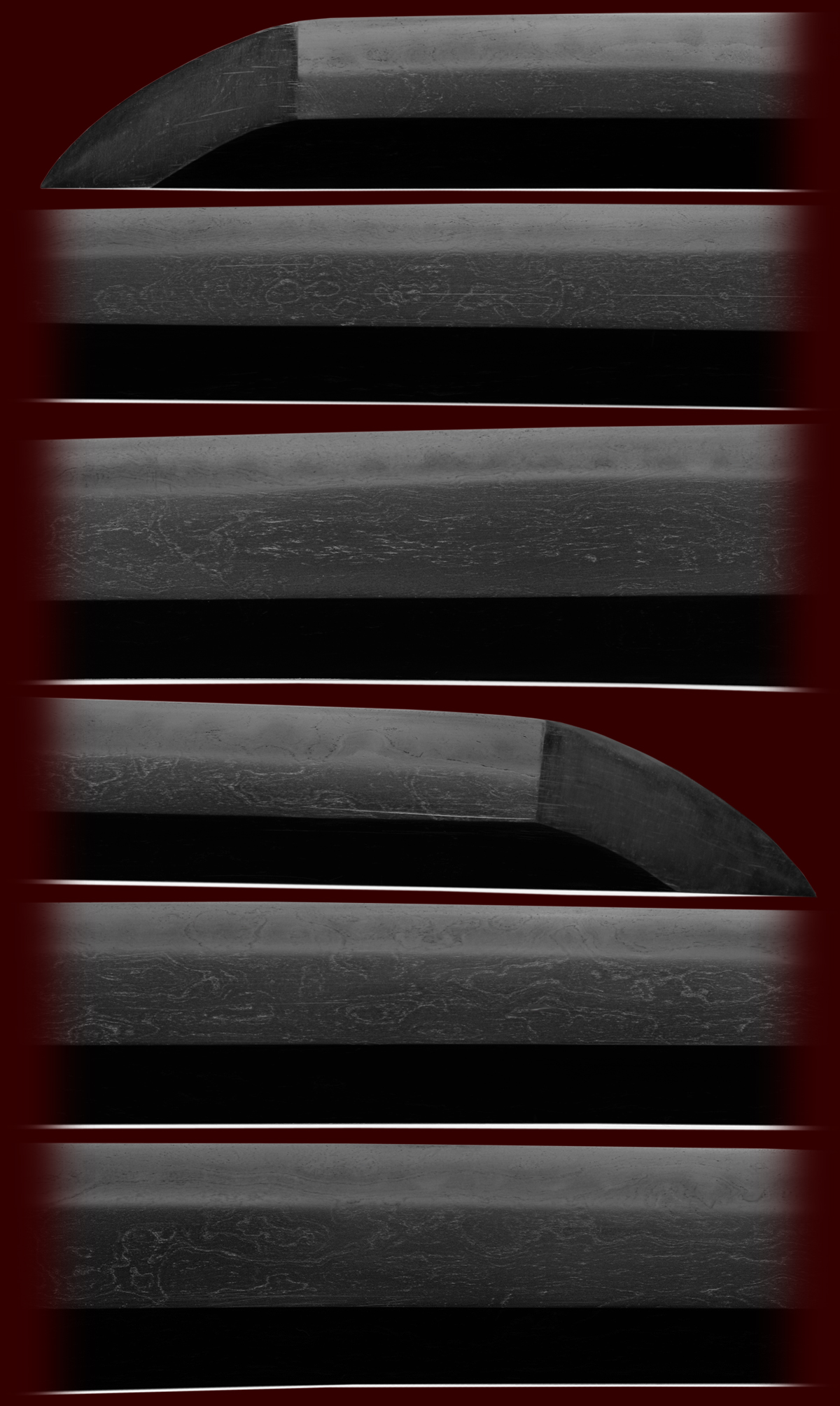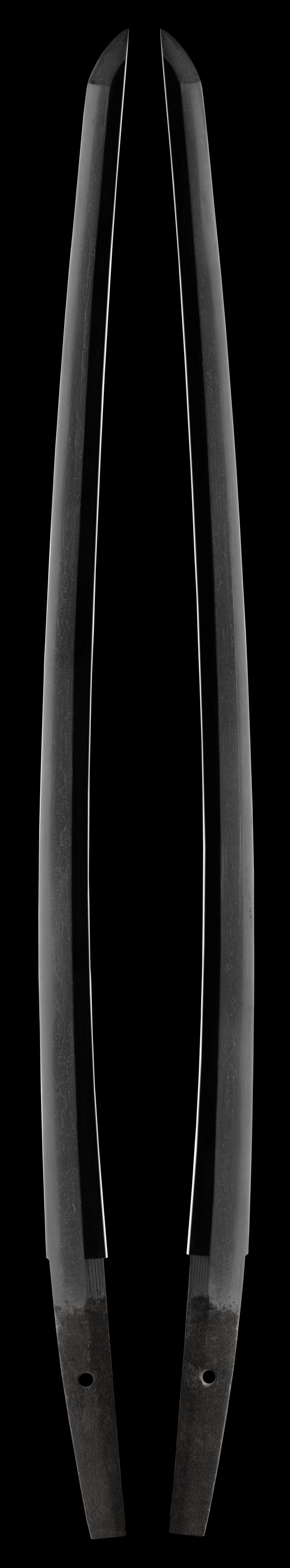 The blade itself is a masterful in sugu-ha just peppered with ara-nie and small activities throughout emulating the great old mino blades of past. The hada is so fine and well worked of ko-itame with mokume. It is covered in ji-nie and has an oily appearance that is found in the best of blades. A rare package!! At 23 � it was most probably used as an uchigatana.