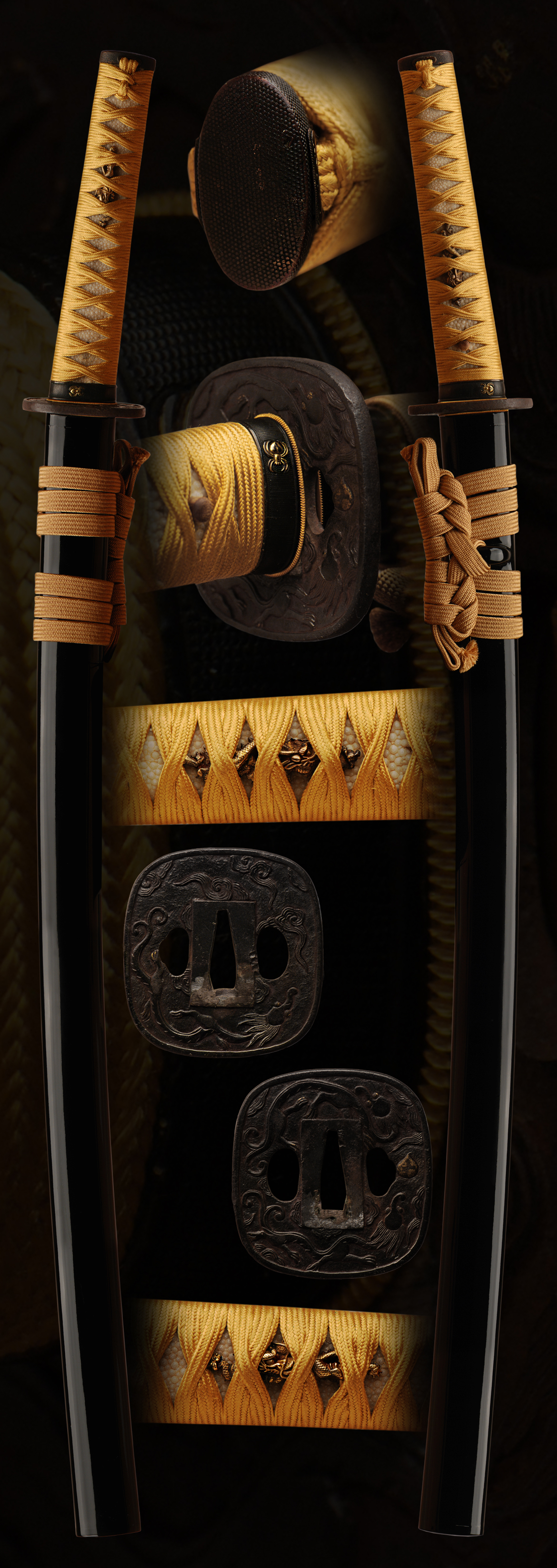 According to legend (mostly from China), the Hō-ō appears very rarely, and only to mark the beginning of a new era -- the birth of a virtuous ruler, for example. In other traditions, the Hō-ō appears only in peaceful and prosperous times (nesting, it is said, in paulownia trees), and hides itself when there is trouble. As the herald of a new age, the Hō-ō decends from heaven to earth to do good deeds, and then it returns to its celestial abode to await a new era. It is both a symbol of peace (when the bird appears) and a symbol of disharmony (when the bird disappears). In China, early artifacts show the Phoenix (female) as intimately associated with the dragon (male) -- the two are portrayed either as mortal enemies or as blissful lovers. When shown together, the two symbolize both conflict and wedded bliss, and are a common design motif even today in many parts of Asia. Gold sageo and ito with dragon menuki finish off these mounts with a wonderful black lacquered saya.