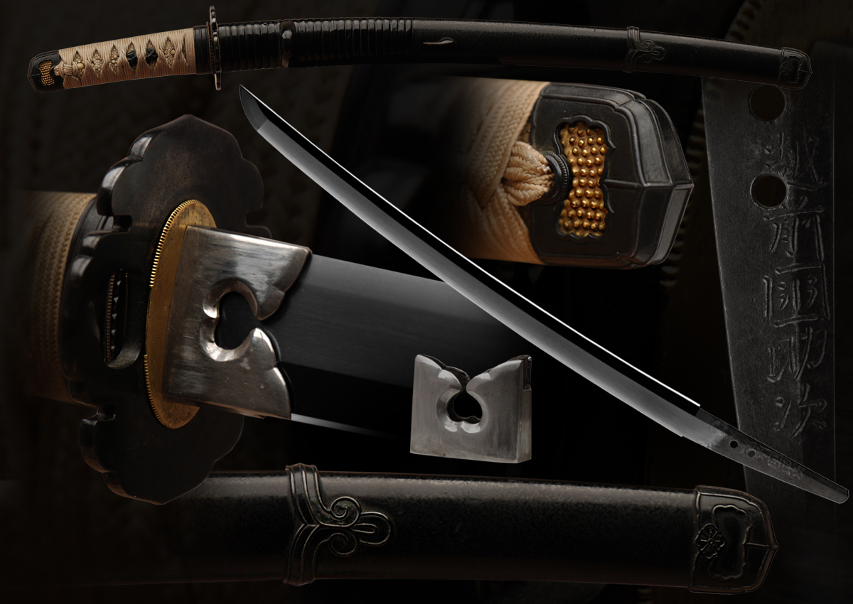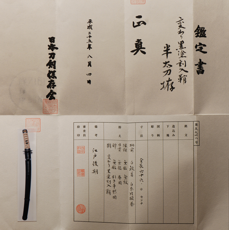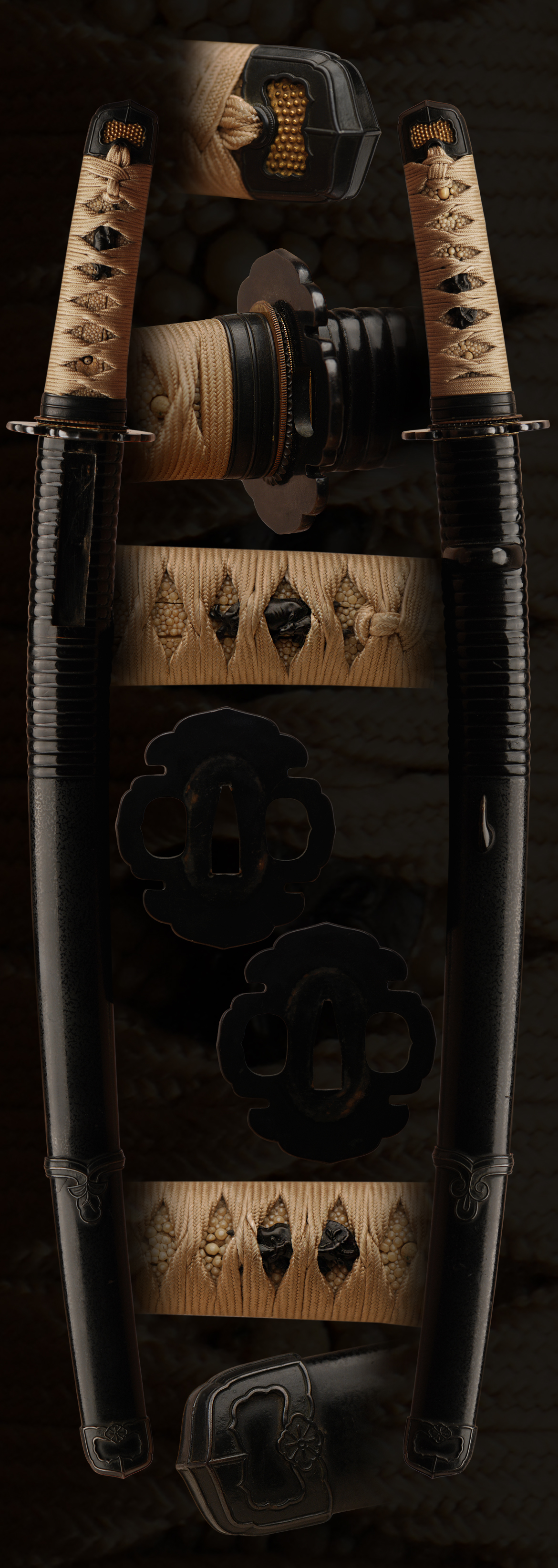 The mounts are very nicely done and consist of a kowari black lacquered carved ribbed saya. The mounts are of the handachi style and are papered also. The menuki are of cattle and can represent agriculture