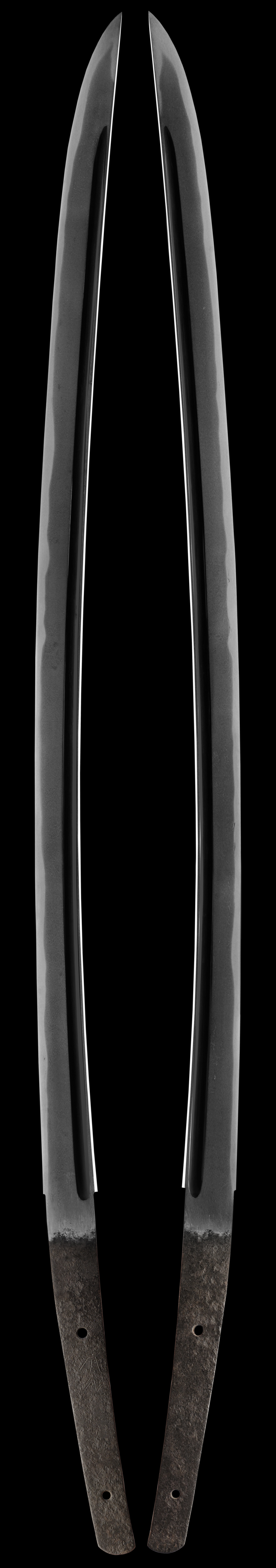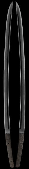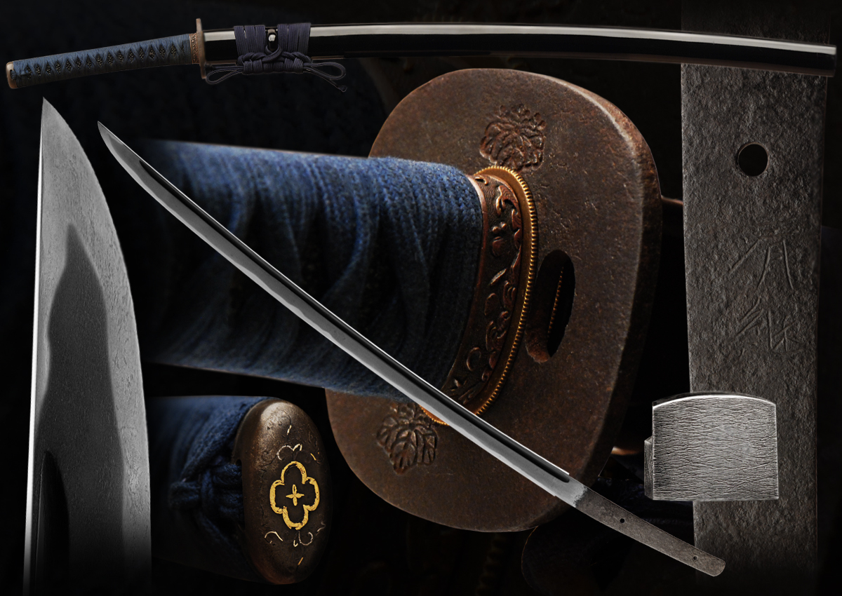 This katana is from the koto era (around 1400's) and is a good quality sword with a very good shape and style. The signature is difficult to decipher and appears to read "Ari( something )". More than likely this is a non listed swordsmith. Many smiths were unlisted if that worked in small towns or if they died young and not many swords were made. It is clear however that the blade is very early and we dated it back to the 1400's at least. The hada has some minor coarseness in places, overall it is tightly forger and is well made. The hamon is active and has good hataraki/activity. For such a old sword that obviously has been used the condition is very good. It is extremely well balance and more than likely was meant to be used with one hand like a kodachi. The hori is in the Bo-hi style and well cut. The mounts have been restored and are in good condition. All the fittings are antique and add to the overall look of this sword. This early blade is very sound for its age and is in a good older polish.