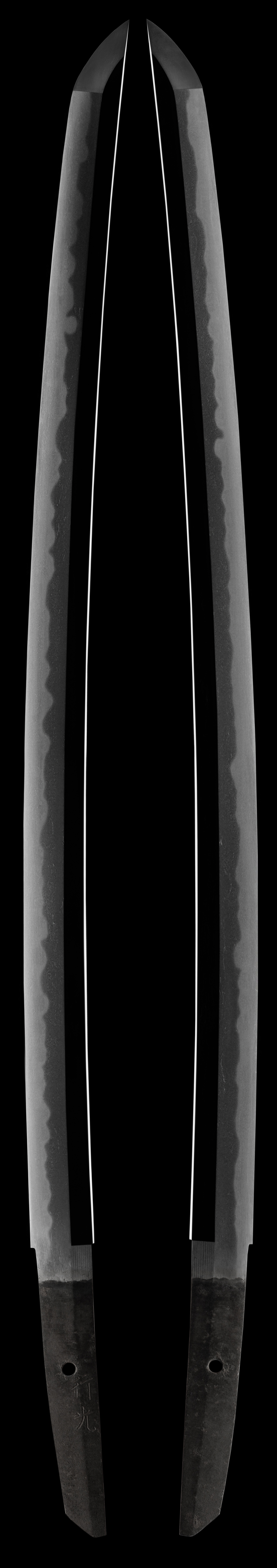 From the Mino Gokkaden The kashu school flourished in Kaga province. It was there that a castle town was built by Maeda Toshiie who was one of Oda Nobunaga's retainers. It was in koto times that the fujishima school started to produce swords in this area. The three schools of note from that area was the Darani, the kiyomitsu and the kaga seki. This sword has a very elegant sori and is signed with a 2 character signature of yuki mitsu.The first Yukimitsu is believed to be the son of Tomoshige. The Yukimitsu smiths show strong Soshu characteristics and also that of the Yamato school. Their tradition flourished into the Shinto era. The hada is composed of a masame-nagare with a hint of itame with ji-nie that jumps off the blade. The hamon is an erratic gunome-midare with togare-ba and much activity. The hamon is just layered with sunagashi, kinsuji ashi and yo. The boshi is so incredibly active that one can study this feature for hours, again layered with strands of nie!! The nakago-jiri is especially kashu influenced finished in Iriyama-gata style. The fujishima smiths used this nakago-jiri often as it became known as "kashu nakago". The yukimitsu smiths used this style of nakago most of all from among the kaga group.