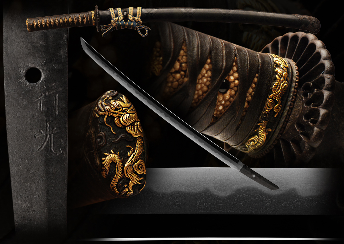 This fine samurai sword shows many the excellent features that are highly regarded in the Kashu school. The overall polish and condition is excellent. The hamon is loaded with beautiful activity and the hada is well forged. This is a very elegant wakazashi from the shinto era. The shape of the blade is very well balanced and is very sharp! We feel that the polish of this sword is excellent and the sword does not need to be polished but it should be place in a shirasaya some day to preserve the polish. The next important feature on this sword is its mounts. These mounts are 100% original and have never been restored or altered. This in itself is a valuable asset for this fine blade. The handle is wrapped in silk that is lacquered. The saya lacquer work is also out of the norm and stands out for its design and quality. The dragon fuchi/kashira are of great quality and the tsukashi tsuba really sets off the overall feel of this sword's mounts. The menuki are fine looking and at the end of the saya it even has a very good iron kojire. This blade can be submitted for papers someday but if not its value will still hold strong as this smith is well known and is in exquisite mounts!