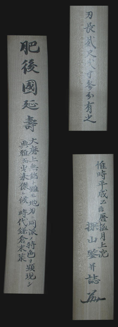 The Enju school, a major school of the Yamashiro tradition worked in the Kikuchi area of Higo province. The Enju school is divided into three periods. This sword dates from the earliest of the Enju periods known as Ko-Enju. This sword is especially unique as it has a beautiful Japanese inlaid on copper within the nakago "Hachiman Daibosatsu". This sword, once a tachi has a very fine ko-mokume hada that bursts with chikei. The jihada is known as Enju-gane which is very similar to Rai-gane but much stronger in appearance. The hamon is based in chu-suguha with deep strong nioi-guchi and the boshi is ko-maru. A truly beautiful Kamakura Tachi that is very pleasing to the eye!!