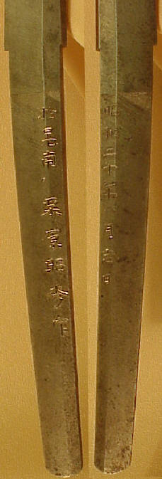 He is from Tochigi-ken, is a former member of the House of Representatives, and has liked tôken since an early age. He has a particular interest in tempering, and is learning from the nidai Masamori. He has established the Nihon Tô Denshûsho (Training School) in the garden at his residence in Akasaka-ku Hikawa-chô, engaged Kasama Shigetsugu nado as teachers, and opened the road to learning to his pupils. After he received the sponsorship of the Ministry of Education for the Nihontô Training School in 1935, he opened the Nihon Tô Denshûsho, and he has worked every year afterward to hold this while publishing the Nihon To and Nihon Shumi (hobby) as publications. He is a man of distinguished service in this world who has worked for the prosperity of swordsmiths, sword polishers and koshirae makers. Signatures: SHIMOTSUKE JÛNIN KURIHARA HIKOSABURÔ AKIHIDE SAKU KORE