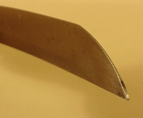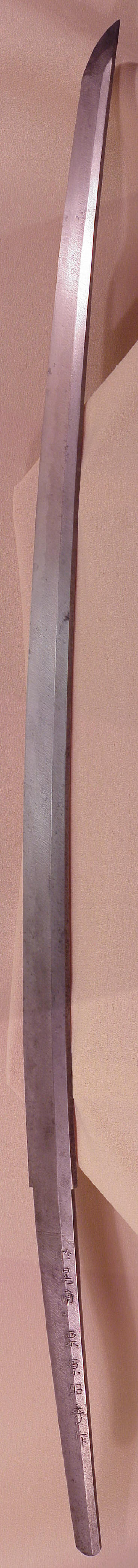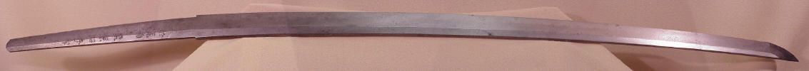 This is a very interesting gendaito made by Akihide. This sword has a chogi hamon, that looks well done. It is ubu and has never been polished or mounted. Note that it has no mekugi ana. It is dated Showa ni ju nen hachi gatsu kiti jitsu. (August 1945). If you put two and two together you will understand why this beautiful Katana was never finished. I am happy to know that the owner of this sword will leave it unpolished, and will care for it as is. This is a sword that has the history of Japan and the United States tied within its past!