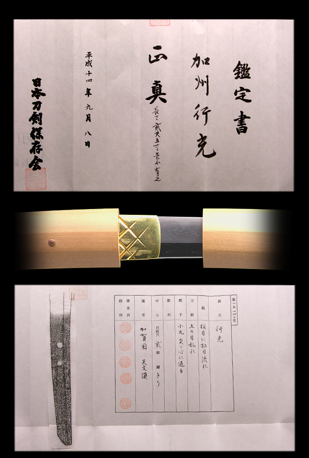 From the Mino Gokkaden The kashu school flourished in Kaga province. It was there that a castle town was built by Maeda Toshiie who was one of Oda Nobunaga's retainers. It was in koto times that the fujishima school started to produce swords in this area. The three schools of note from that area was the Darani, the kiyomitsu and the kaga seki. This sword has a very elegant sori and is signed with a 2 character signature of yuki mitsu.The first Yukimitsu is believed to be the son of Tomoshige. The Yukimitsu smiths show strong Soshu characteristics and also that of the Yamato school. Their tradition flourished into the Shinto era. The hada is composed of a masame-nagare with a hint of itame with ji-nie that jumps off the blade. The hamon is an erratic gunome-midare with togare-ba and much activity. The hamon is just layered with sunagashi, kinsuji ashi and yo. The boshi is so incredibly active that one can study this feature for hours, again layered with strands of nie!! The nakago-jiri is especially kashu influenced finished in Iriyama-gata style. The fujishima smiths used this nakago-jiri often as it became known as "kashu nakago". The yukimitsu smiths used this style of nakago most of all from among the kaga group.