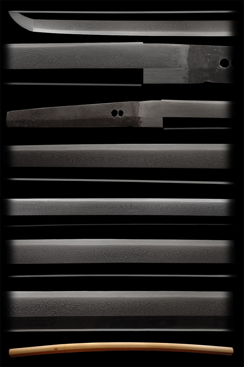 This exquisite daito shows clearly the quality of fine hada from Gassan smiths. The hada is mokume, masame with some ayasugi mixed in small amounts. The hada is extremely well forged and is very tight. There are no flaws on this sword at all. The unbelievable activity in the this hada is rarely found on sword of this period. The sugu-ba is also well made with hada showing thru in places and hataraki can be found in many areas. Even though this hada is so active the overall felling of this sword is quiet and elegant. This sword was given an attribution to Gassan Sadaharu of the Sadayoshi Mon by the NTHK. My personal feelings on this sword is that it may very well be made by Gassan Sadakazu and the fact that it is not signed by him may have been a factor in attributing this sword to Sadaharu. I have polished a few swords from Sadakazu. This is why I feel this blade may have been made by him, Sadakazu swords are very popular for many reasons. For more information click on "GASSAN SADAKAZU".