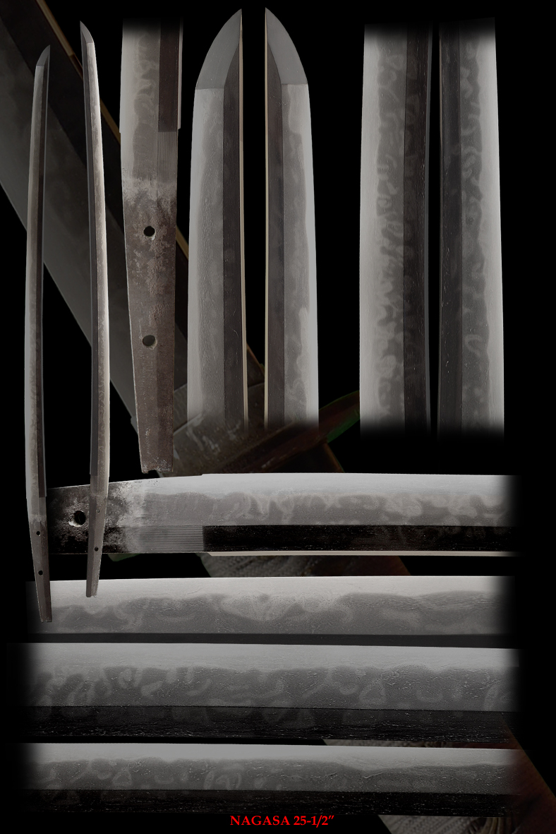 This sword has an abundance of activity all over the blade and has a full hardened kissaki. The hada has some course hada and some in the shinogi-ji. No flaws are visible on this old sword and is very interesting. Hitatsura is very desirable to many collectors as is Soshu den work.